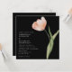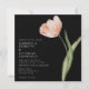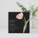 En modern minimal bröllopsinbjudan innehåller en persikofärgad tulipp med vit typografi som sätts på ett svart inbjudningskort. Anpassa alla viktiga detaljer, t.ex. brid och groom namn, datum och plats för bröllop. Den omvända sidan är också svart med initialer i vit typografi.