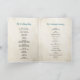 Elegant bröllop-programmet med påfågelfjäder och teal ordalydelse, vikta häften. Biblivet program för boho bröllop och andra evenemang.
