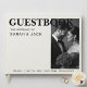 The cover features elegant serif typography with a prominent "GUESTBOOK" heading. Below, you can customise "THE WEDDING OF" text followed by the names of the couple (e.g., Sarah & Jack) and the specific wedding details (Volume, Date, and Location).