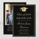 Elegant black graduation announcement with a gold grad cap, the graduate's name and their class year in a formal gold script, and their school, major and honors in classic gold typography. Add a photo on the back and personalize your message.