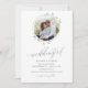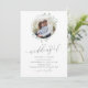 Den här elegantens fotobröllopsinbjudan innehåller din bild överst, omgiven av en enkel grönt-andedräkt. Den är parad med ett romantiskt kalligrafiskt skript.