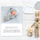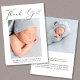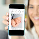 Ett enkelt och elegant födelsemeddelande för flicka eller pojke med foto och "Tack" i ett snyggt med en hjärtsvikt. Anpassa med sin fullt namn, ankomstdatum och födelsestatus i modern typografi. På den motsatta sidan lägger du till ytterligare ett foto och anpassar ditt meddelande och tackar dig för meddelandet.