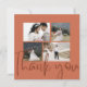 Ett enkelt dubbla-kort som du använder med terracotta-bakgrund och fyra svarta och vita fotografier kommer att älskas av alla dina gäster i bröllop. Lägg till dina bästa foton från bröllop och byt ut meddelandet till dina gäster på baksidan av kortet. Du kan också ändra färg i texten "Tack".