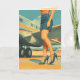 En snyggt kvinnlig pilot i en marinblå uniform och högklackar står tryggt bredvid ett vintage flygplan, vilket utesluter sofistikering och resetillstånd.
