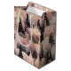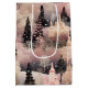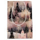 A delicate pink and black pattern with snowy hills and ethereal village buildings among elegant pink and black pine trees.