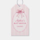 Watercolor pink gift tag showcasing a soft ribbon illustration, minimal stripes, and gentle dotted frame for a charming holiday-inspired design.