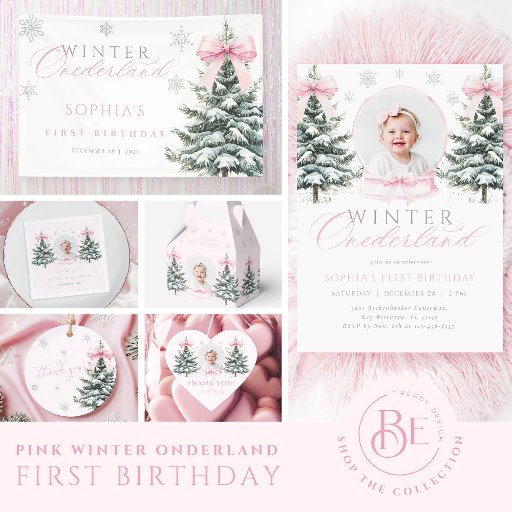 Celebrate your little one’s first birthday with this legant Pink Bow Winter Onederland First Birthday Invitation. Featuring a hand-painted snowy Christmas tree wrapped with soft pink ribbons and delicate snowflakes, this charming design brings a touch of winter magic to your celebration. Perfect for a baby girl’s December birthday or any winter-themed party. Fully customizable text.