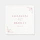 These wedding napkins feature a minimalist and elegant design with a soft pastel pink color palette, creating an airy and sophisticated atmosphere. The layout is balanced and symmetrical, with abstract geometric line art in the corners adding subtle decorative accents. The typography combines a serif font for the names with a cursive script for "and," enhancing the refined and contemporary look. Perfect for modern weddings, these napkins exude grace and anticipation, making them ideal for celebrating this significant life moment.