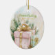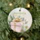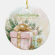 A Christmas ornament shows off a beautiful watercolor painting of an elegantly wrapped light pink holiday package. It has beautiful vintage gold ribbons, seasonal green pine accents and pine cones. A smaller mint green present is beside it. This is a lovely nostalgic image of Yuletide presents for those special people on your list.