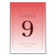 This elegant wedding table card features a minimalist design with a soft gradient background transitioning from light pink to coral. The focal point is a large, bold numeral "9" in dark brown, accompanied by the word "TABLE" above and customizable names and date below, all set in a clean sans-serif font. The layout emphasizes clarity and simplicity, creating a warm and inviting atmosphere perfect for formal occasions. Its modern aesthetic makes it an ideal choice for couples seeking understated elegance on their special day.