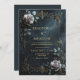 This design blends the delicate beauty of nature with a sophisticated, moody atmosphere. Set against a deep, textured charcoal background, two realistic pale pink roses bloom in opposite corners, accompanied by shimmering metallic silver leaves and slender, graceful stems. A thin, ornate rectangular frame in a dark bronze finish features intricate scrollwork and elegant filigree, providing a majestic and structured focal point for your details. The contrast between the soft floral tones and the dark, textured backdrop creates a sense of timeless romance and regal mystery. As a wedding invitation, this piece is an exquisite choice for a formal evening ceremony, a romantic winter wedding, or a gothic-themed gala. It offers a unique and polished first impression, promising guests an event filled with grace and dramatic elegance. This striking botanical imagery works beautifully for any refined social gathering or high-end branding project.