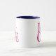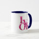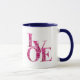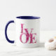 The elegant modern coffee mug features the word "LOVE" in a floral lettering extracted from a macro photo of a spring blooming pink hydrangea.