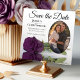 De här vackra datumkorten är det perfekt sättet att låta dina vänner och familj få veta om ditt kommande bröllop. De har en blommigt som är både modern och elegant med en enda färgad för lila av plommon i ro som sedan lång tid tillbaka reflekterar i ett bassäng i vatten med vinkara och krämer med ditt foto i en ovalformad ram. Bildtexten läser Spara datum med utrymme för namnen, datum och plats på en klassisk vit bakgrund. Baksidan är en marmorerad violett, plommon eller äggplanta färg.