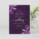 Denna eleganta bröllopsinbjudan har plommonblomsterbuketter kompletterade med silverfärgad falsk grönska i två hörn, på en bakgrundsbild av plommonfärgad akvatint agat. Baksidan ger plats för bröllopsdetaljer, tillsammans med en QR-kod som gästerna kan skanna för att besöka er webbplats och svara, vilket sparar kostnaden för att trycka och skicka separata svars kort.
