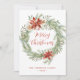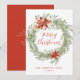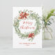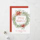 Julkort i elegant blommigt med texten "God jul" i ett rött skript omgivet av en krans med röda vattenfärgspinnsettias, kräm ro, gräs, groddar, hullbär och andra vinter-grönska. Anpassa framsidan av julkortet utan foto med din familj namn och året nedan med röd text. Baksidan av det rustiska helgdag innehåller ditt personliga meddelande med vit text.