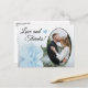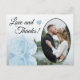 Detta vackra vykort är ett enkelt men tänkvärt sätt att tacka gästerna i bröllop. Den har en underbar design med ditt foto från bröllop i ett ovalt format ram och en enda lång dammig pulverblått färgad ro som reflekterar i bassäng i vatten. Bildtexten lyder "Kärlek och tack" och det finns utrymme för din anpassningsbar på baksidan och din namnteckning.