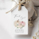 Elegant presenterar märkre för flicka-duschen med "en söt liten pumpa är på väg" och "Tack" i mjuk grått-typografi och ett skript med en hjärtsvikt och vattenfärger av rosa- och krämpumpor och blommigt buquets.