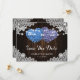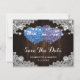 Romantic rustic purple and blue floral wedding save the date card featuring hydrangea hearts against a barn wood background adorned with white floral lace and string lights. Two burlap hearts and delicate floral lace on a rustic wood background at the back.
