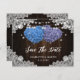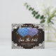 Romantic rustic purple and blue floral wedding save the date card featuring hydrangea hearts against a barn wood background adorned with white floral lace and string lights. Two burlap hearts and delicate floral lace on a rustic wood background at the back.