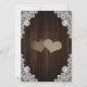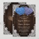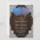 Rustic purple and blue wedding invitation featuring two heart-shaped hydrangea flowers on a barn wood background adorned with white floral lace and string lights. Elegant and romantic wedding invite perfect for your purple and blue rustic wedding party.