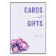 This wedding tabletop sign features a minimalist design with a soft lavender background and deep purple text that reads "CARDS and GIFTS" in bold, uppercase letters, complemented by an elegant cursive "and." A vibrant illustration of protea flowers adds a touch of natural beauty to the lower left corner. The overall style is modern and sophisticated, conveying gratitude with the phrase "Thank You" in a simple sans-serif font. Perfect for expressing appreciation at your special event, this sign combines refined typography with floral elements to create an inviting and thoughtful atmosphere.