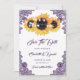 Purple and sunflower wedding save the date card featuring sunflowers, string lights, burlap hearts and delicate floral lace.
