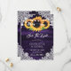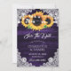 Purple and sunflower wedding save the date card featuring sunflowers on a rustic wood background adorned with elegant floral lace, burlap hearts and string lights. Matching items available.