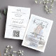 Den här designen har en elegant-OSA-fotobröllopsinbjudan, med en enkel blommmall för blå blommigt, med ett klassiskt foto för onlinens gästsvar, ett vanligt kalligrafiskt skript, ett minimalistiskt typografi boho-svit, klassvis modern minimal, med en skannerbar QR-kodwebbplats, en digital nedladdningsgrön bladfil enkel, fotovellum transparent effekt, en klassisk elegant stationsvit papperssida