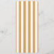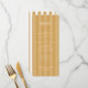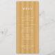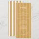 Denna eleganta bröllopsmeny har en vertikal layout med en varm, gul-gul bakgrund som accentueras av jämnt fördelade mörkare gula ränder. Designen använder ett klassiskt serif-teckensnitt för menyrubrikerna och objekten, vilket skapar en sofistikerad och formell look, medan namnen längst ner är utformade i ett intimt skrivet teckensnitt. Farbpaletten av guldtoner förmedlar en känsla av lyx och värme, perfekt för en förfinad matupplevelse. Anpassningsbara sektioner möjliggör personalisering, vilket gör den idealisk för par som planerar sin speciella dag.
