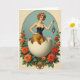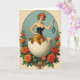 Designed with an oval frame set against a calm teal background, the artwork centers on a blonde woman rising from a huge cracked eggshell, her soft curls decorated with red and orange blossoms 🌷. She wears a fitted black corset edged with white lace, a flowing golden skirt, white lace gloves, and a small pearl necklace that adds a gentle, intimate touch. One hand rests on her hip while the other lifts a gold orb pendant, held as carefully as a keepsake shared between close friends. Inside the orb, a tiny scene shows a snow-capped mountain under a clear blue sky, like a private place meant for two to imagine together. Around the eggshell, orange and red flowers spill downward with green leaves threading along the lower edge of the frame, adding warmth and closeness to the scene 🐇. A short greeting appears near the top inside the oval, set in small white lettering that stands out against the teal. At the bottom, a gold ornamental flourish curls outward beneath the flowers and the broken shell.