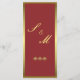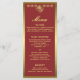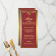 En elegant bröllop-meny med guld och rött, med guldfärgat inslag för att tillföra lite elegans och stil till ditt bröllop eller andra särskilda tilldragelser. Designer noterar att allt kan anpassas helt, från guld inslag överst på menyn till ordalydelsen för varje kurs. Ändra (eller t.o.m. ta bort) om du vill. På menyns baksida visas möhippans parentegram (som också kan ändras eller tas bort helt).