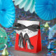 Röda och svarta penselskor med elegant svart och silver med hög klack på en vacker röd och silver-bakgrund. Den här eleganten röd och svart högklacksruta har text på framsidan och under klaffen.