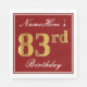 Den här enkla och elegant pappra napkin-designen innehåller ett meddelande som "Namehär's 83 Birthday" (med "83:e" som har en faux-guld-liknande färgning) i en röd färgad fyrkantig yta med en enkel gräns-kontur. Namn är i en text som liknar en skript med vit färgad och kan anpassas. Napkins som dessa skulle kanske kunna användas i en födelsedagsfest till någon som firar sin åttiotredje födelsedag. [~Z0000138]