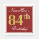 Den här enkla och elegant pappra napkin-designen innehåller ett meddelande som "Namehär's 84 Birthday" (med "84:e" som har en faux guld-liknande färgning) i ett fyrkantigt område med röd färgad med en enkel gräns-kontur. Namn är i en text som liknar en text med en vit färgad och kan vara personlig. Napkins som dessa kan kanske användas i en födelsedagsfest till någon som firar sin åttiofjärde födelsedag. [~Z0000138]