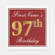 Den här enkla och elegant pappra napkin-designen innehåller ett meddelande som "FirstName's 97:e födelsedagen" (med "97:e" som har en faux-guld-liknande färg) i en röd färgad fyrkantig yta med en enkel gräns-kontur. Namn är i en text som liknar en text med en vit färgad och kan vara personlig. Napkins som dessa skulle kanske kunna användas i en födelsedagsfest till någon som firar sin nittiosjunde födelsedag. [~Z0000138]