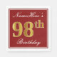 Den här enkla och elegant pappra napkin-designen innehåller ett meddelande som "Namehär's 98 Birthday" (med "98:e" som har en faux-guld-liknande färgning) i en röd färgad fyrkantig yta med en enkel gräns-kontur. Namn är i en text som liknar en skript med vit färgad och kan anpassas. Napkins som dessa kan kanske användas i en födelsedagsfest till någon som firar sin nittioåttonde födelsedag. [~Z0000138]