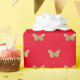 Denna pappra förpackning har elegant faux guld-folie-fjäterfly mönster på röd bakgrund.