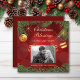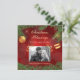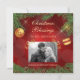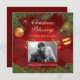 Vilken elegant, söt, platta julkort som dessutom har ett fotomall! Öst och grund har gräns i grönt nål och gräs. Några guld-stjärnor gnistra i bakgrunden och två röda och guld dekorerade träd lökar hänger på sidorna. Bilder och text placeras på en övertoningsröd bakgrund med en subtil cirkel mönster. Ditt eget foto visas under två blanka guld-klipp bilder, och det finns tre fält i ljusa guld. Bilder och text placeras på en övertoningsröd bakgrund med en subtil cirkel mönster. Baksidan av inbjudan är heltäckande röd. *Tack vare skräp och knölar för klippbilder som används i den här designen.