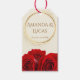 Add a touch of romantic luxury to your wedding favors with these sophisticated gift tags. Featuring a soft, light cream background, this design is framed by an elegant gold border and a delicate arrangement of deep red roses at the base. The center beautifully displays the bride and groom's names and wedding date in a refined gold-tone typography. These editable tags are the perfect finishing touch for your Navy and Gold or Red and Cream themed celebration, ideal for guest gifts and keepsakes.