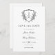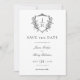 Elegant ReEmergency Blommigt Vapensköld Monogram Bröllop spara datum-kort i svartvitt utan tidslinje har en vapensköld i vintage stil som är dekorerad med Fransk Ro och klassisk skriptkalligrafi för namn av bruden och trimmen.