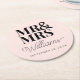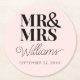 Elegant Rehearsal Förlovningsfest Classic Round Papper Underlägg. Anpassa mallen med ditt efternamn och datum för bröllop, förlovning eller årsdag. Perfekt till repetitionsmiddagen, förlovningsfesten eller bröllopsmottagningen. Kommer i rosa, svartvitt, guld och bruna alternativ.