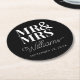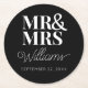 Elegant Rehearsal Förlovningsfest Classic Round Papper Underlägg. Anpassa mallen med ditt efternamn och datum för bröllop, förlovning eller årsdag. Perfekt till repetitionsmiddagen, förlovningsfesten eller bröllopsmottagningen. Kommer i rosa, svartvitt, guld och bruna alternativ.