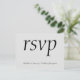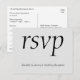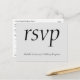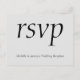 Denna eleganta svarskortdesign för RSVP har texten "rsvp" på framsidan, tillsammans med en personlig beskrivning av evenemanget/ tillfället. Den har också ett anpassat svarsformulär på baksidan som mottagaren ska fylla i, tillsammans med en anpassad adress dit de ifyllda svarskorten ska skickas. Svarskort som detta kan användas för att ta reda på vem som kommer att delta i en bröllopsmottagning, en pensionsfest, en examensfest, en bröllopsdag eller någon annan fest.