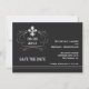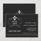 Meddela dina vänner och familj om dina bröllopsplaner med dessa Eleganta Retro Stil Fleur de Lis Spara Datum korten. Kortet har en elegant Fleur de Lis-symbol design med utrymme för att lägga till ditt bröllopsdatum. Kortet läser "spara datum" i en retro stil vit tryck. Personifiera med dina namn och bröllopsdatum. Visas här på en kol svart bakgrund.