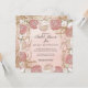 "Inbjudan till Möhippa om Blommigt i Elegant Guld Glitter." Blek pastellbakgrund för rosa kombineras med oljepastel painterly Peony och Ranunculus blommor i ett kvadratiskt inbjudningsformat. Vintage rulla arbete löv grey i ro guld glitter ger glam. All grafik har målats av en internationellt licensierad artist och designer, Audrey Jeanne Roberts, copyright.
