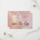Elegant Ro Guld Spara datumet med ornatskrift för kalligrafi. Mallen är konfigurerad så att du kan anpassa baksidan med information om firande. Utformningen har en trendig med blandad bakgrund av faux-folie från ro guld, vattenfärg, folie från ro guld och stoft från glitter. Baksidan har också ömtålig löv med gnistra. Bläddra i butiken för att samordna OSA kort-, klistermärken- och quinceanera-inbjudningar.