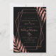 Inbjudan dina gäster i stil till din eller dina nära bröllop med ro guld lämnar det geometriska mönster svarta vigselkortet för. Du kan enkelt lägga till egna namn och uppgifter om bröllop genom att klicka på knappen "anpassa". Genom att klicka på "anpassa ytterligare" kan du ändra teckensnittet färg och stil. Kontakta mig med e-post om du behöver hjälp eller matcha produkter på shabnamahsanatzazzle@gmail.com