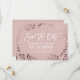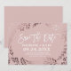 Detta kort för elegant guld och rosa bröllop spara datum är perfekt för en klass bröllop. Utformningen har en fantastisk bild av ro guld blad i leafy ram i rosa och är parad med ett lysande kursivt teckensnitt. Anpassa meddelandet till webbplatsen par namn, bröllop, plats och bröllop. Obs! Den här utformningen har inte äkta folie av ro guld. Det är en högkvalitativ grafik som framstår som en shimmery ro guld.
