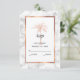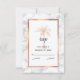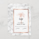 Ge dina gäster att svara på din bröllopsinbjudan med den här elegant OSA kort som innehåller ett modernt skript, grått av kol med en kopparkonstnärlig handflatan-träd och kopparro av koppar från ro guld på framsidan. En vit och grått marmor bakgrund framför och bakom kortet.