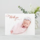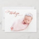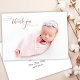 Modern Chic Elegant Calligraphy Ro Guld Script Newborn Baby Photo Tack Birth Announcement Card. Innehåller en söt "tack"-text i ett handskrivet calligraphy swash svan-teckensnittsskript i FAUX rosa ros guld-folie. Förskapat personligt meddelande på baksidan. Underbar för flicka eller pojke. Enkel att anpassa med ditt baby-foto och din information.